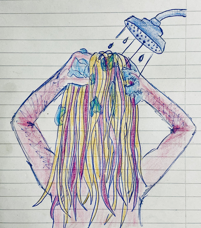 Keď som ešte bývala u našich, umývala som si dredy nad vaňou a teraz v sprchovom kúte. Sprchový kút máme dosť veľký, takže sedím na podlahe a sprchovaciu hlavicu mám namierenú na hlavu zozadu. Toto je systém, ktorým si umývam dredy iba preto, že nemám veľmi špinavé vlasy a nemusím tam sedieť pol hodinu. Ide mi predovšetkým o to umyť pokožku hlavy a na rýchlo zmyť dredy po dĺžke.