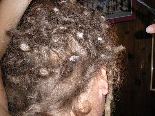 Ako môžete vidieť na fotke nižšie, v tomto prípade sa zákazník veľmi nestaral o dredy a zanedbal hĺbkové čistenie. Tak sa v dredoch usadila špina. Táto špina dokáže niekedy dredy zvnútra úplne zničiť. Rozčesávanie by skutočne bola iba strata času, lebo všetky vlasy by aj tak vypadali.