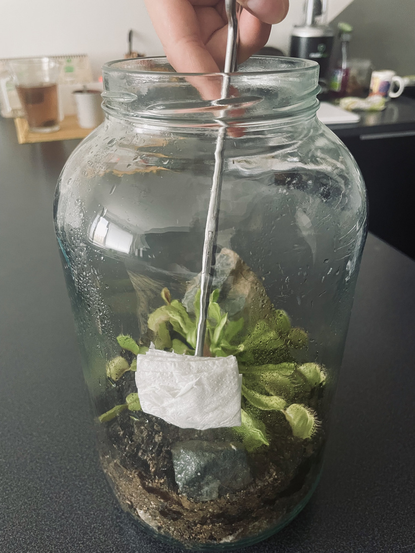 ° Ak máš zatvorené rastlinné terárium, je potrebné sledovať vlhkosť, ktorá sa tvorí na stenách vo vnútri nádoby. Ak je zarosená tak, že do nej ani nevidíš, nechaj ho 1-2 dni otvorené. Znamená to, že má veľa vlhkosti a to môže dôjsť až k tvoreniu plesni.