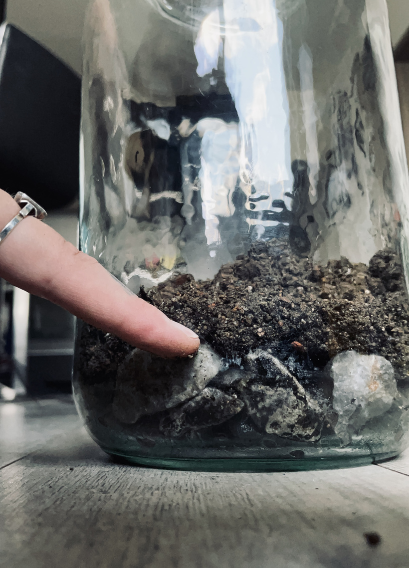 Zeminu do rastlinného terária si môžete kúpiť a namiešať. V návodoch sa spomína perlit, rašelina, zemina pre izbové rastliny,.. Ja som použila piesok z pieskoviska, hlinu z lesa podrvené kúsky kôry zo stromu a drobné kamienky. Vo všeobecnosti však platí, že by sa mala do tejto zmesi primiešať aj zemina, ktorá je najvhodnejšia pre rastlinky, ktoré v nej budú zasadené.