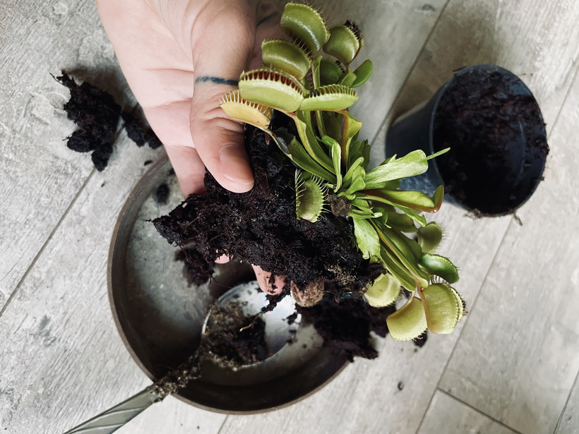 4.) Pripravíme si rastlinku. Vyťahuj ju z kvetináča na poslednú chvíľu a ak je pôvodná hlina v poriadku (nie je v nej pleseň alebo nejaký hmyz), korene úplne nečisti. Keď bude mať rastlina "so sebou" trochu svojej hliny, lepšie sa prispôsobí novému prostrediu.