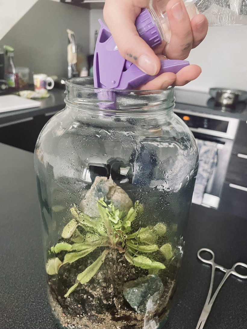 7.) Keď si s výsledkom spokojný/á, pridaj vodu. Plantárium je najlepšie polievať rozprašovačom. Na fotke som vodu nastriekala na steny pohára, pretože mäsožravá rastlina nemá rada kropenie a v kvetináči sa zalieva len zospodu - to znamená do misky.
