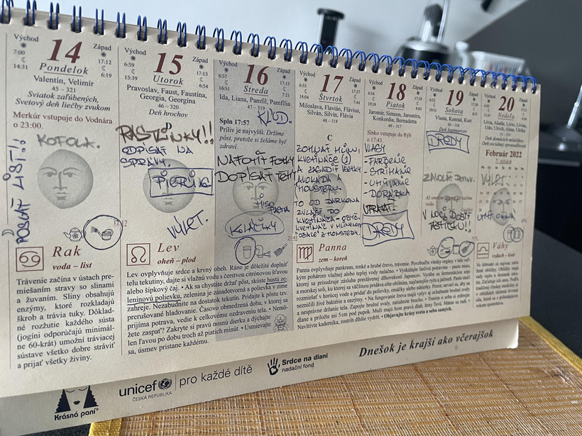Využtie ho naplno a zapisujte si to, čo musíte spraviť alebo vybaviť. Nepíšem iba o tom, kedy máte ísť k zubárovi alebo s deťmi na preventívnu prehliadku. Presádzanie rastlín, nákup, návšteva, kedy oprať veci, týždenné upratovanie, výmena posteľného prádla, prechádza, stretnutie,..čokoľvek vám napadne.