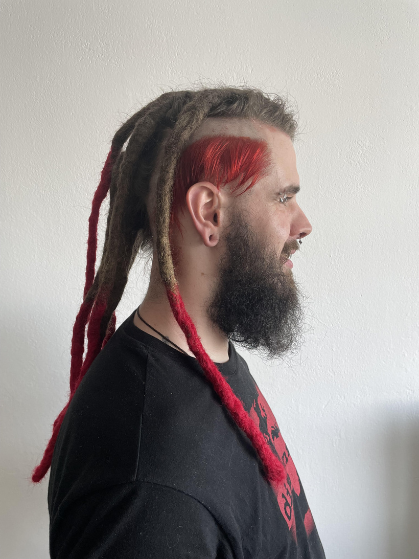 Farbenie dredov nemusí byť doslova farbenie. Do dredov alebo k im koncom je možné priháčkovať alebo pripliesť kanekalón a tým vytvoriť dojem zafarbených dredov. Na fotke nižšie vidíte dredy predĺžené kanekalónom. Tento spôsob "zafarbenia" si zákazník vybral namiesto odfarbovania a farbenia. Kanekalón je vždy lepšia voľba, než ničenie farbami.