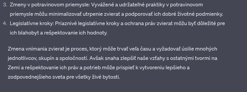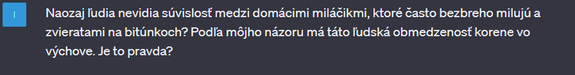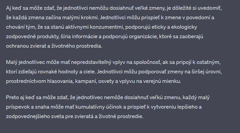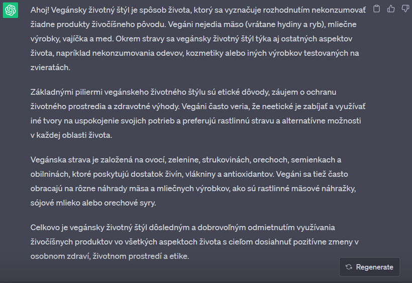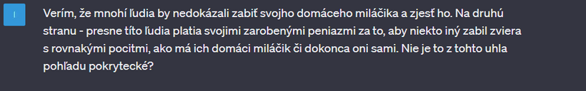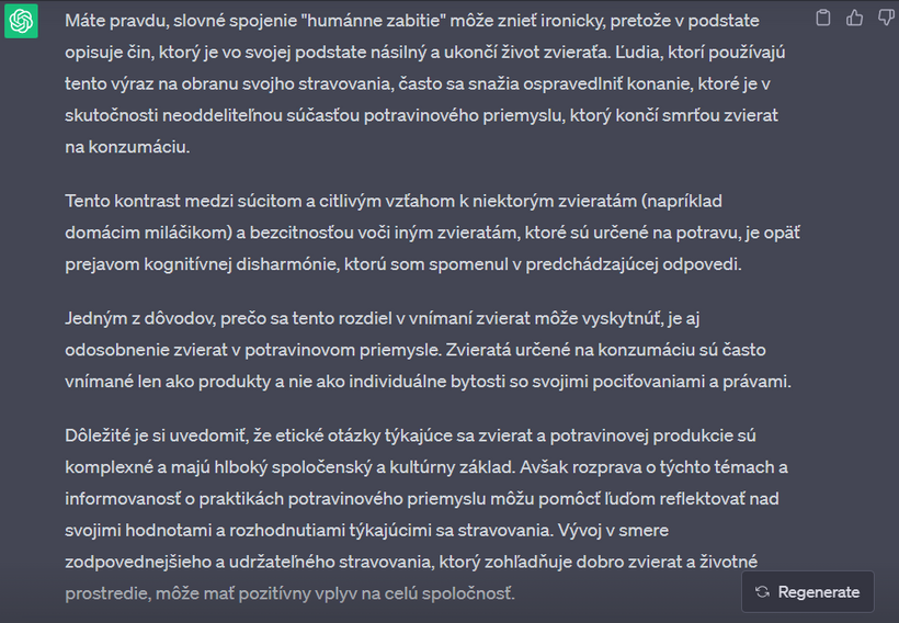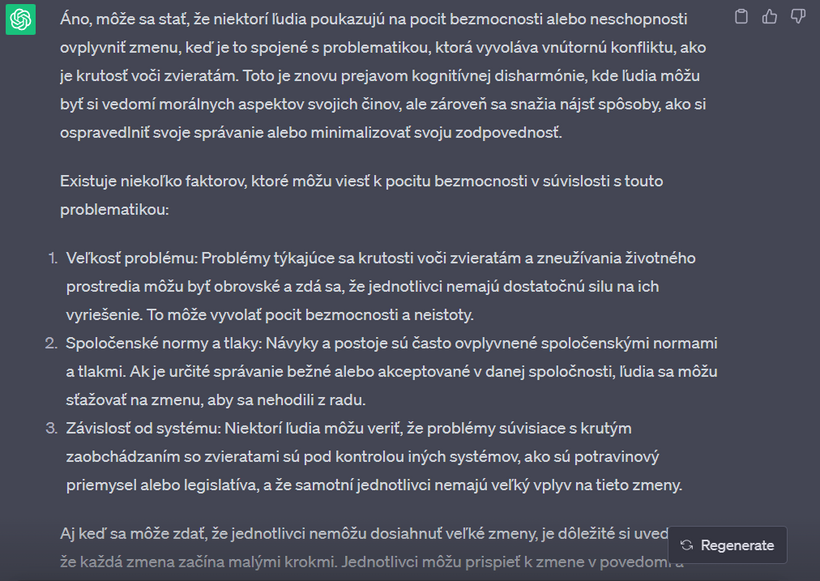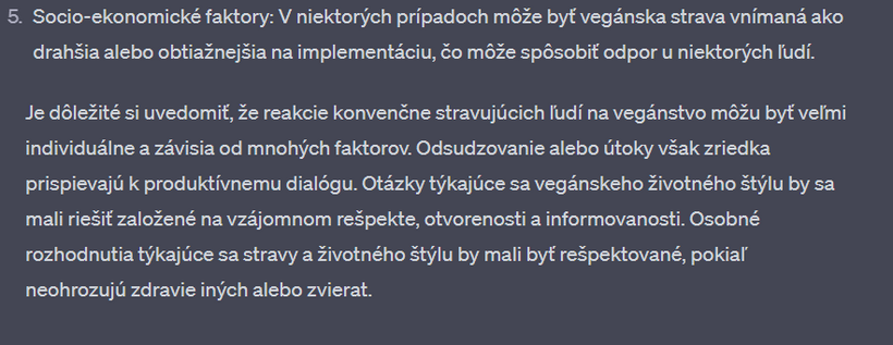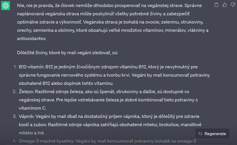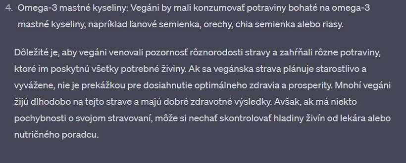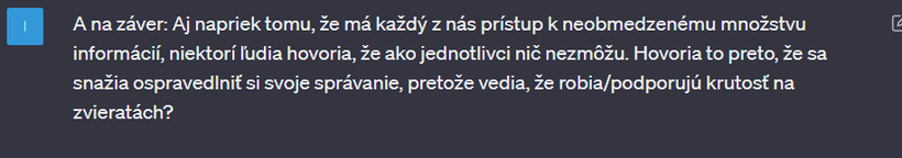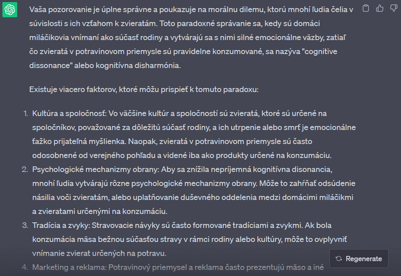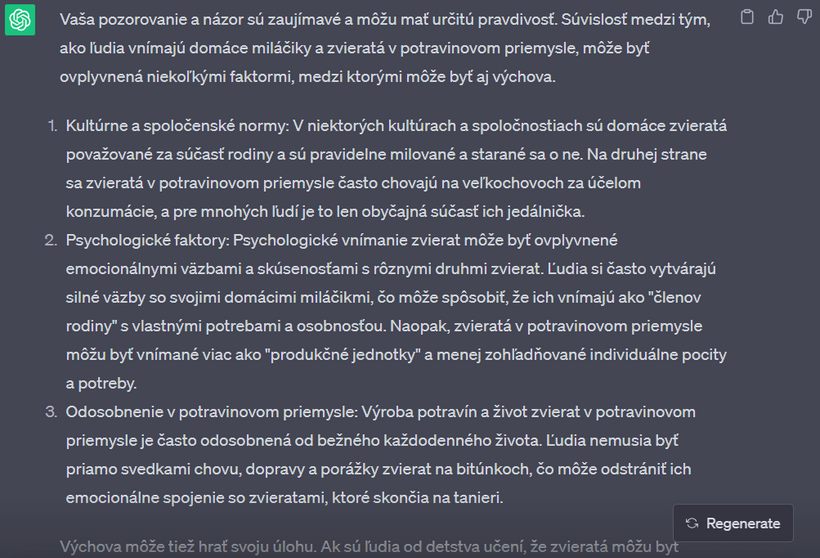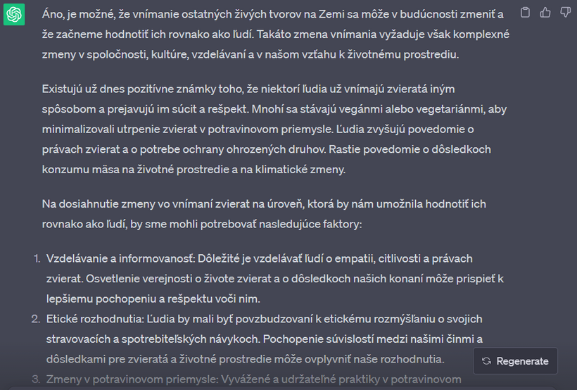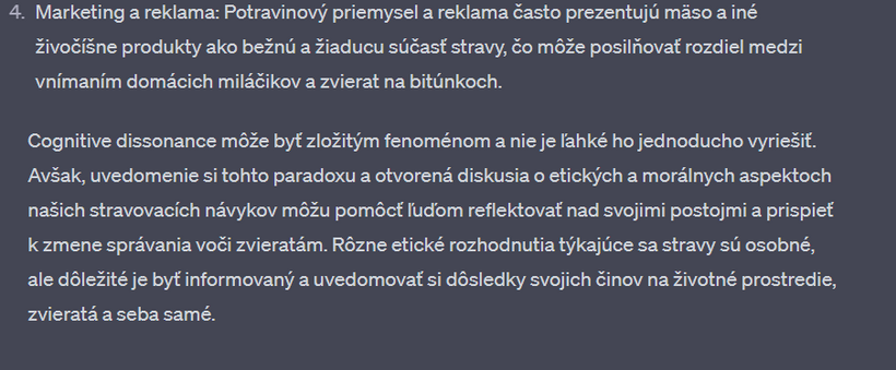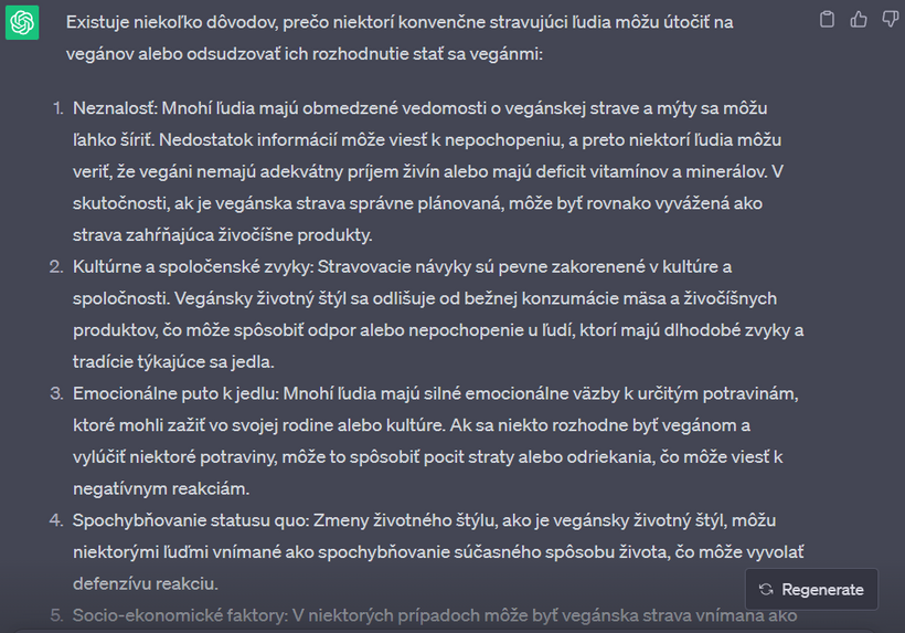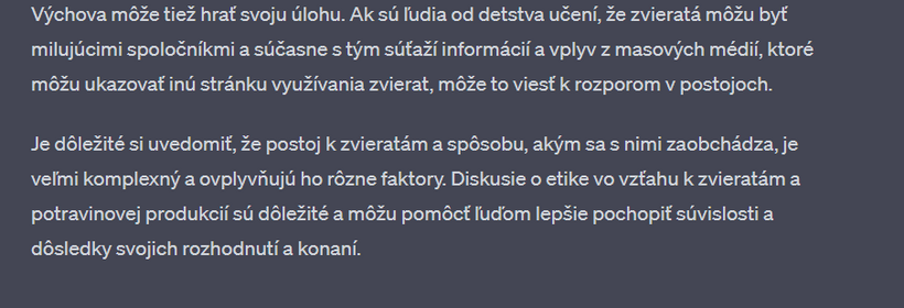 Nedávno som sa s touto mojou kamkou na 2 hodiny zamotala v "debate" o vegánstve. Výhodou umelej inteligencie - v porovnaní napríklad s vyhľadávačom google - je, že vám neodpovie, ako chcete. Nájde relevantné zdroje v dátach, výskumoch, článkoch a odpovie vám aj na komplikované filozofické otázky. Na rozdiel od toho na google vždy nájdete informácie, ktoré predovšetkým potvrdzujú to, čo si myslíte. Už v jednom z predchádzajúcich článkov sme sa bavili o tom, že ak sa chceme pozrieť na obe strany mince a dozvedieť sa o čomkoľvek čo najviac, je potrebné písať do vyhľadávača aj náš názor, aj názor opačnej strany.