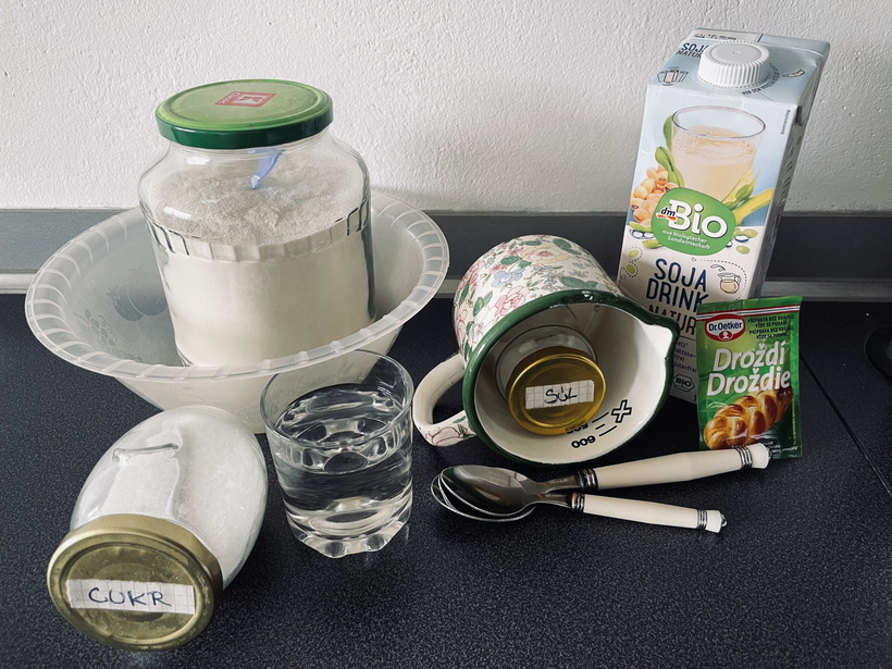 1.) Najskôr si pripravíme všetky ingrediencie a potrebné nádoby. Misa, v ktorej bude cesto kysnúť, by mala byť dostatočne veľká, aby vám z nej cesto nevyliezalo. Budeme potrebovať už spomenutú soľ a cukor, múku (takú, aká sa odporúča vo vašom recepte), vodu/mlieko, odmerku a samotné kvasnice.