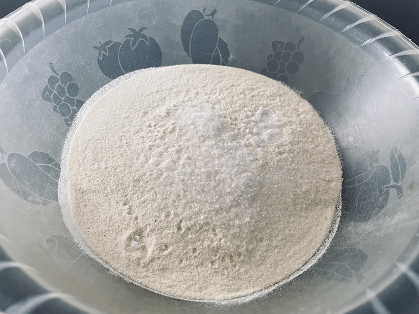 4.) 5oo-6oo gramov múky zmiešame so soľou a cukrom. Riadime sa množstvom podľa toho, aký recept robíme - tak, ako som spomenula na začiatku.