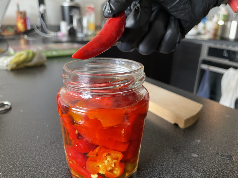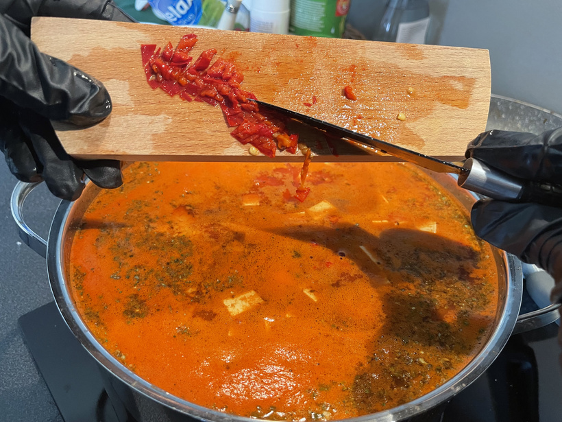 11.) Ak máte rasi pikantný guláš, teraz je čas pridať do neho chilli papričku. My máme silné papričky, takže dávame iba jednu.