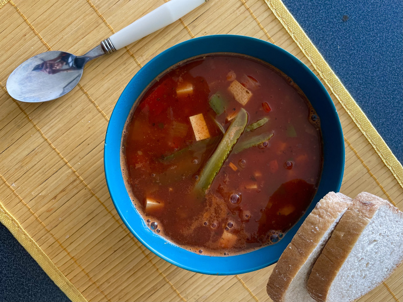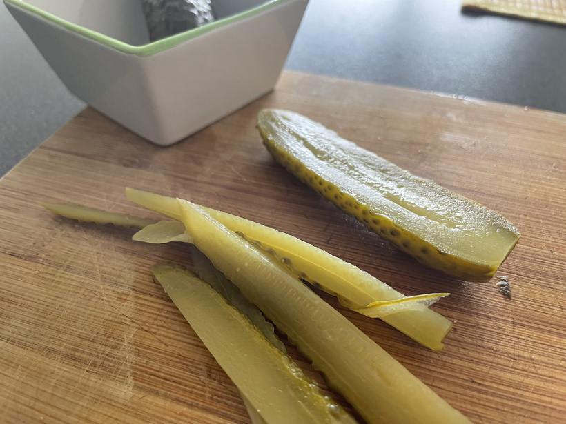 13.) Do polievky na tanieri alebo v miske nakrájam zaváranú uhorku. Pridá jej to zaujímavú chuť.