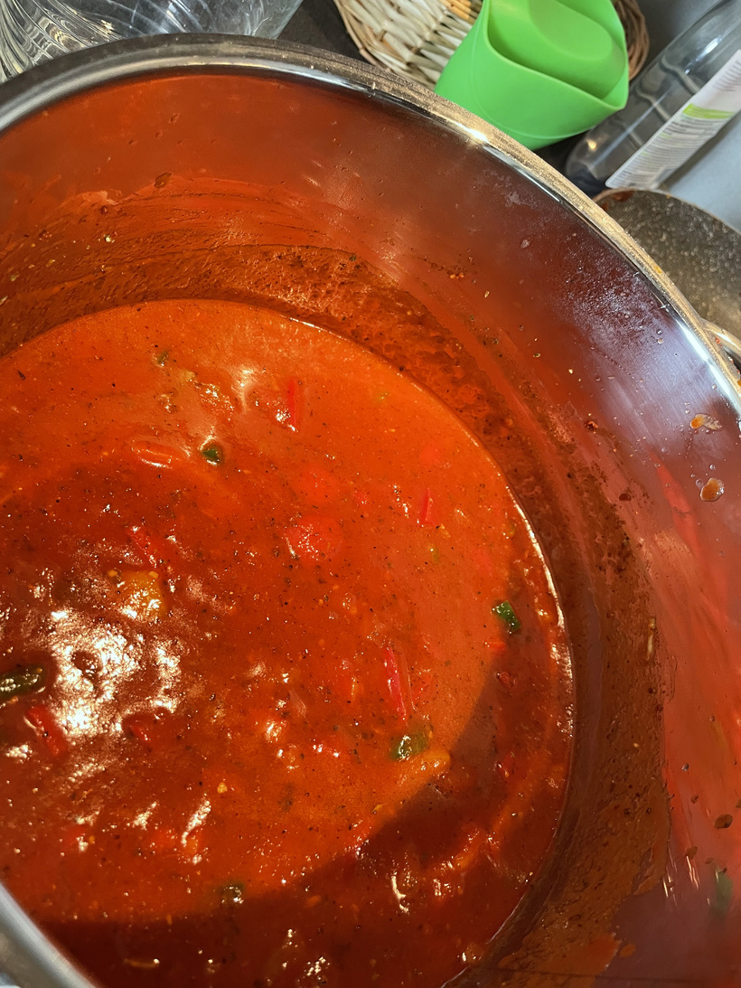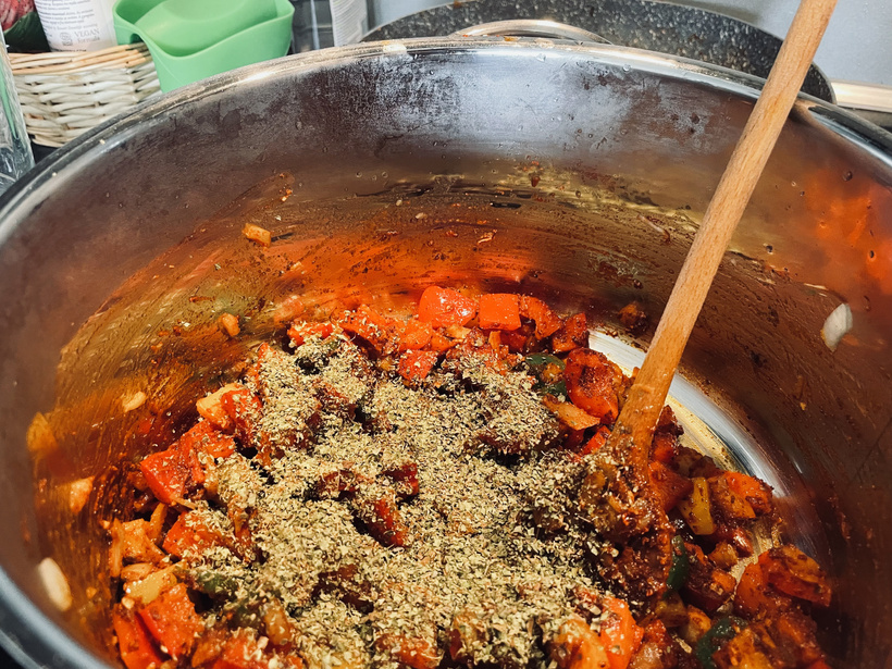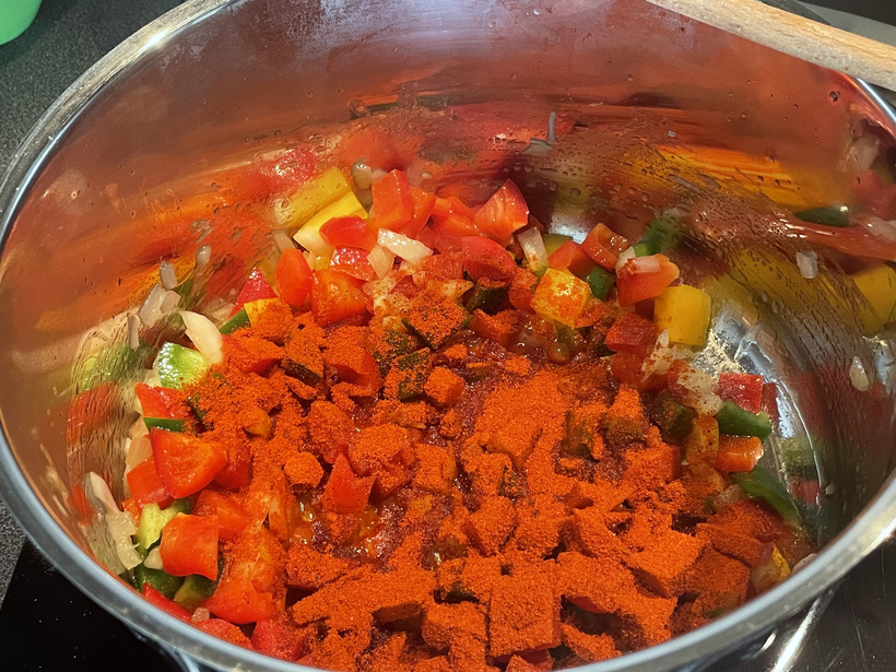 Vývar sme mali vopred nachystaný preto, lebo akonáhle pridáme k zelenine mletú papriku, vzniká nám v hrnci suchšia zmes - a my nechceme, aby sa nám pripálila. Keď sa mletá paprika nechá príliš dlho na "suchom teple", dostáva horkú chuť. Tej sa potom veľmi ťažko zbavíme. Preto sa snažte dodržať tento postup. Nie je to nič chaotické ani stresujúce. Jednoducho si nachystajte všetky veci vopred, aby ste to nemuseli riešiť za pochodu.