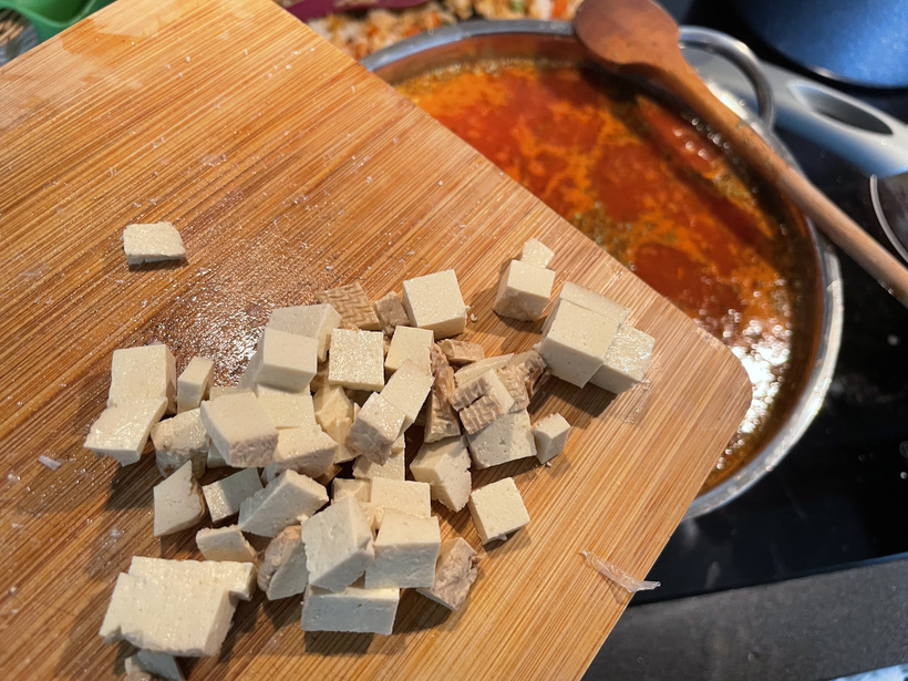 1o.) Akonáhle sú v hrnci všetky ingrediencie, necháme sporák na nízkej teplote (chute sa spájajú) a nakrájame si na kocky údené tofu. Niekto by si možno pomyslel, že je dobré ho najskôr osmažiť. Tí z vás, ktorí čítali článok Tofu ako priateľ ale vedia, že čím dlhšie je údené tofu vystavené teplu, tým viac sa stráca jeho údená chuť. Preto ho pridáme do gulášu až ku koncu.