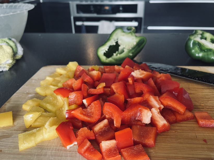 3.) Medzitým si nakrájame papriku. V základných ingredienciách som písala o jednej červenej paprike, ak ich ale máte viac alebo máte aj iné farby, kľudne ich môžete použiť. Nepoužívajte ale viac, ako 3 papriky - bude jej v guláši potom zbytočne veľa.