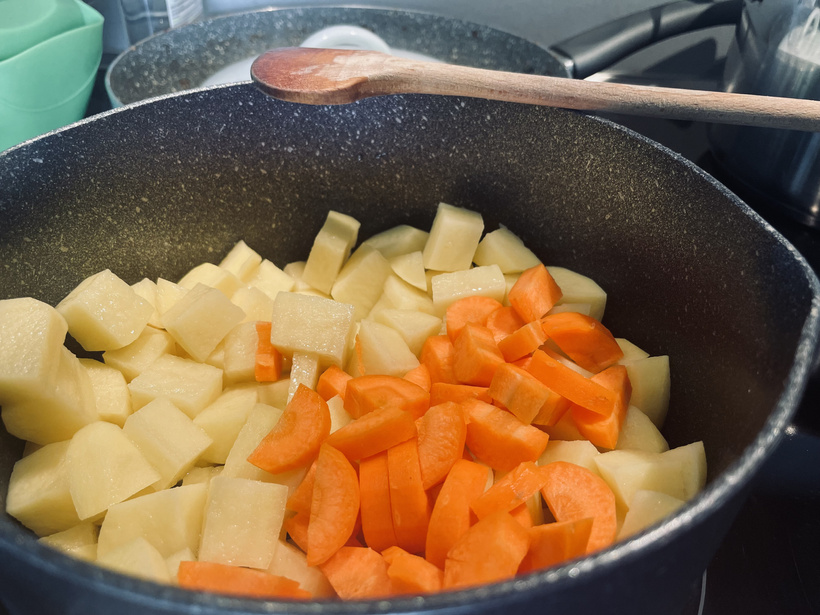 5.) Zemiaky s mrkvou teraz odložíme z plameňa. V prípade, že nie sú úplne hotové, nemusíte mať obavy - budú sa ešte variť v guláši.