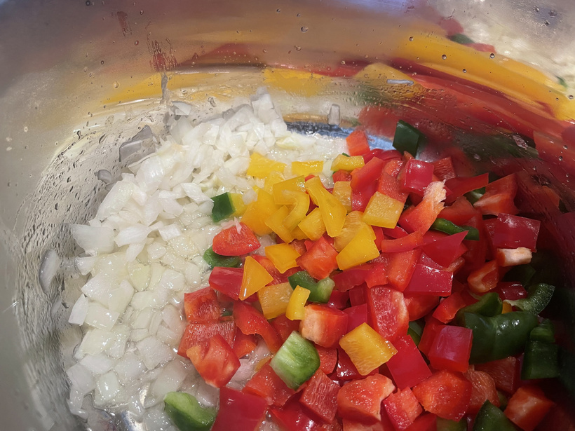 4.) Vo väčšom hrnci si na oleji začneme smažiť cibuľku. Zvolíme stredný plameň - nechceme, aby sa nám cibuľa opiekla len čo sa otočíme, ale aby sa pomaly pripravovala. Cibuľa postupne púšťa šťavu a my ju občas premiešame. Po asi 5 minútach pridáme nakrájanú papriku/papriky.