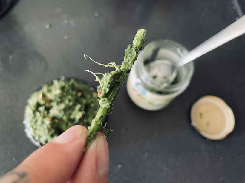 Na fotke dole môžete vidieť "vlásky", o ktorých som písala vyššie. Vyvarujete sa ich tým, že nebudete mlieť stonky.