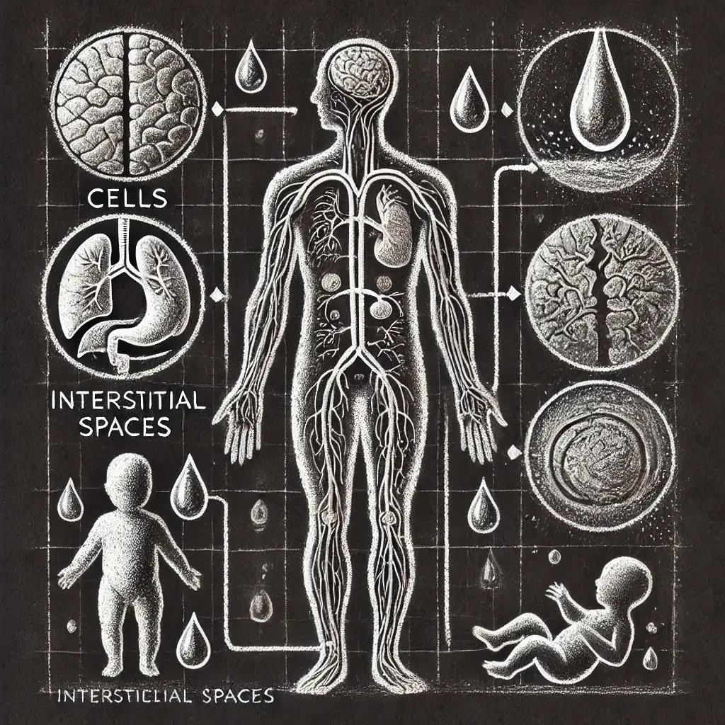 V našom tele nie je voda rozložená rovnomerne. Približne ⅔ vody máme v bunkách, ďalšia voda sa nachádza medzi bunkami a vodu máme aj v krvi.