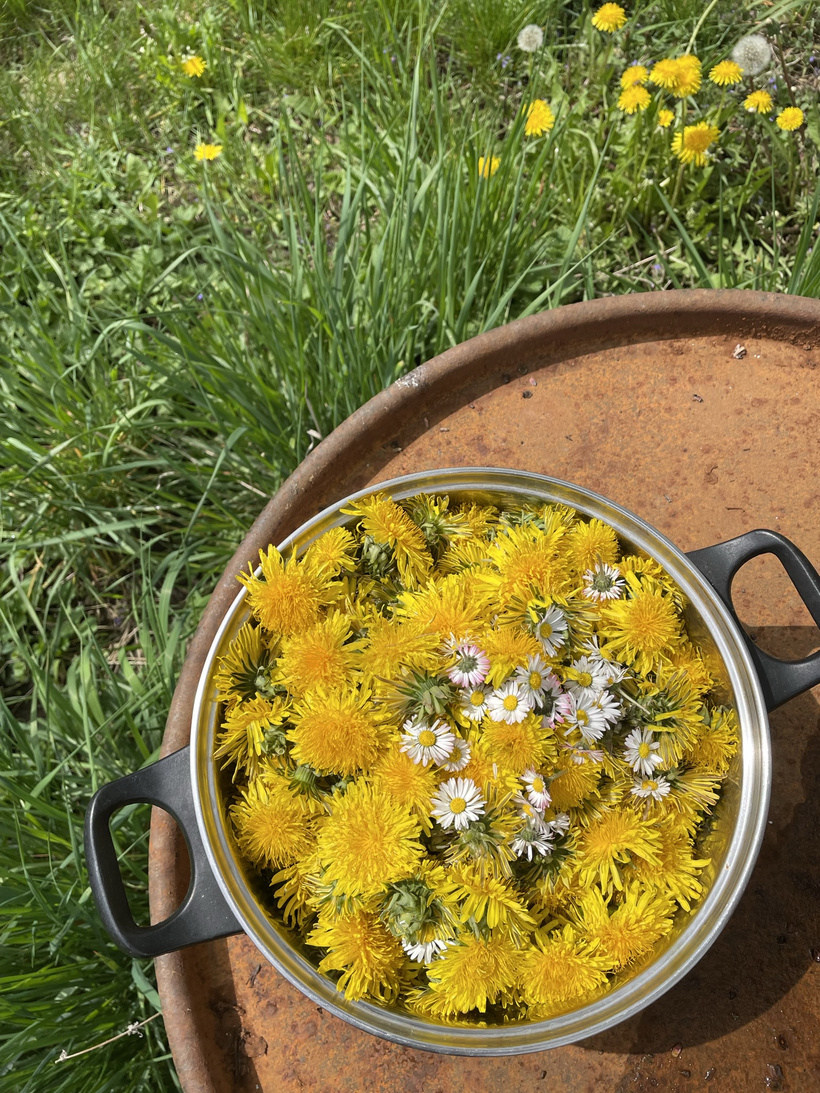 Do nádoby nazberáme hlavičky púpav - snažíme sa trhať púpavu priamo pod hlavičkou, aby sme nemali v nádobe aj horké stopky. Natrháme 4oo kvetov.