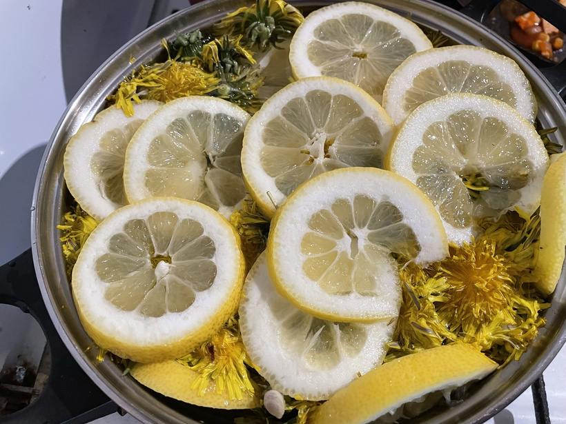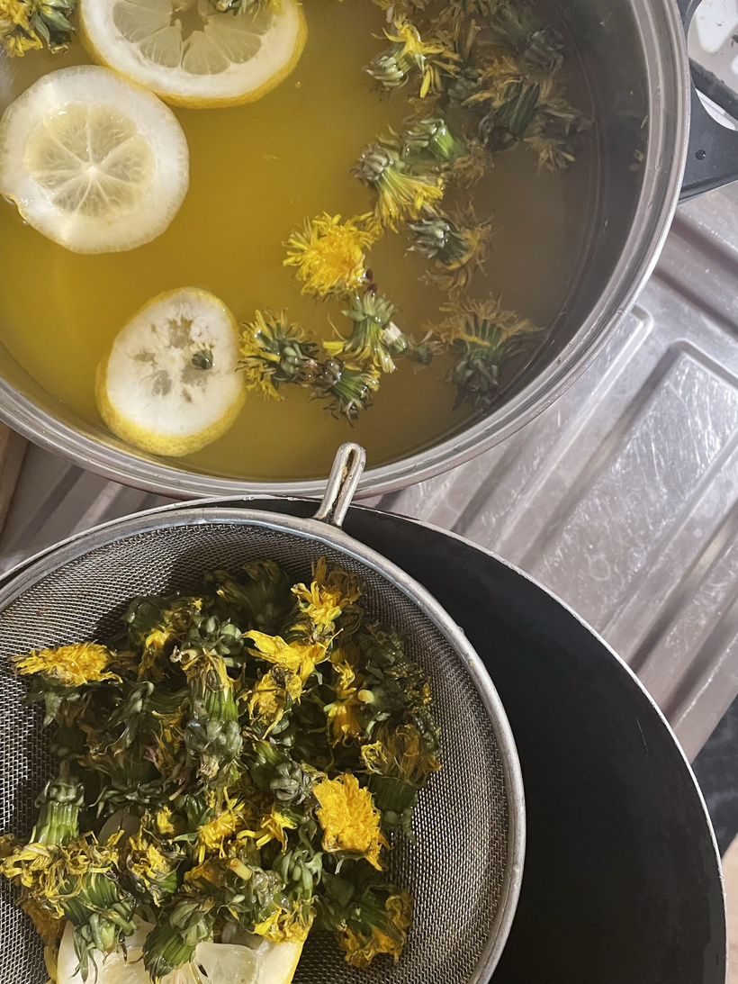Po 24 hodinách túto zmes precedíme. Ja ju prelejem cez sitko do hrnca a povytláčam vodu z citrónov a púpav čistými rukami.