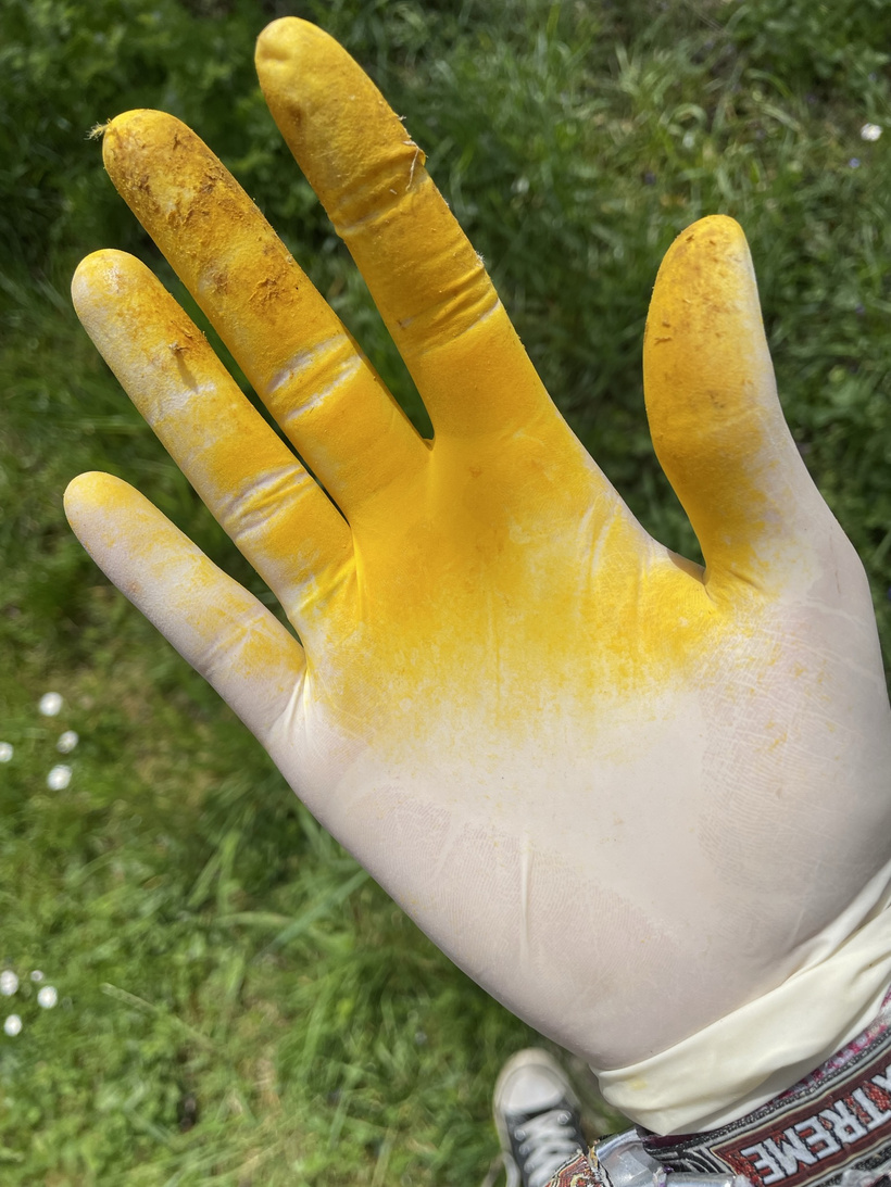 Ja mám pri zbere na jednej ruke aj rukavicu (gumennú alebo igelitovú rukavicu napríklad z farby na vlasy), aby mi výlučky z púpavovej stopky nezafarbili prsty. Rovnako tak to platí aj pre peľ na kvetoch.