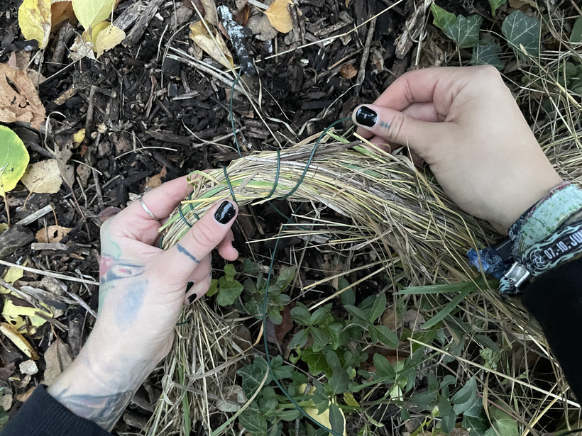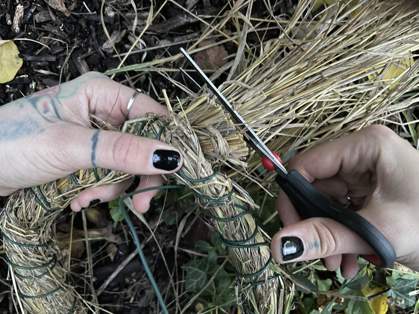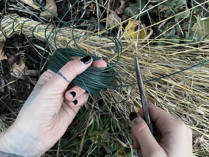Slamu postláčaj a poskrúcaj a postupne ju hneď obmotávaj drôtom alebo zväzuj špagátom. Je to naozaj veľmi jednoduché. Ak máš trávu kratšiu, bude to chcieť pravdepodobne uťahovať drôt na hustejšie. Ak je dlhšia, môžeš nechať väčšie medzery.