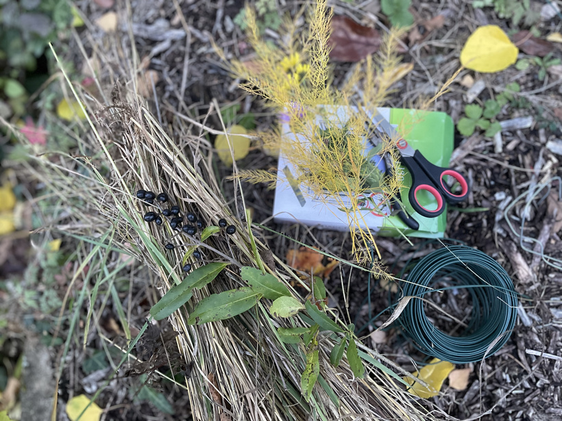 Takže slama a drôt je všetko pre základ a ďalej som si nechystala ešte nožnice a nejaké halúzky, ktoré mi padli do oka.